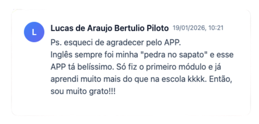 Um SuperApp como solução. Dentro da mentoria, em lições de 20 minutos por dia, você tem a possibilidade de aprender inglês focado no Legislativo com apoio da IA para os pontos que não entender. O aprendizado definitivo do idioma para que ele não seja um empecilho para você.